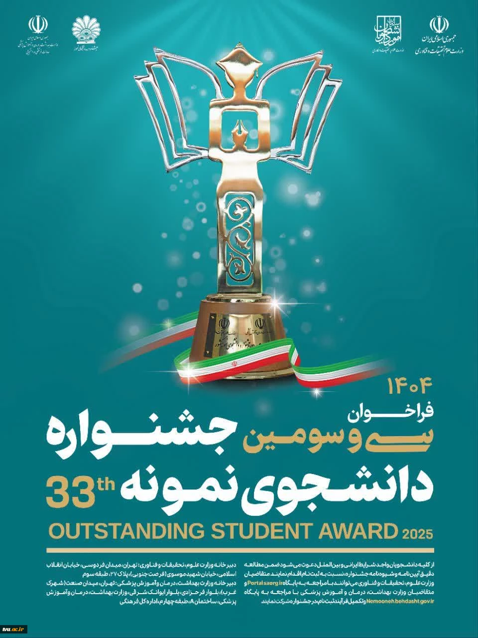 امتیاز دهید : ثبتنام سی و سومین جشنواره دانشجوی نمونه سال 1404 تا ۱ آذر ماه تمدید شد. 2 پنجشنبه 1 آبان 1404 ساعت 9:30