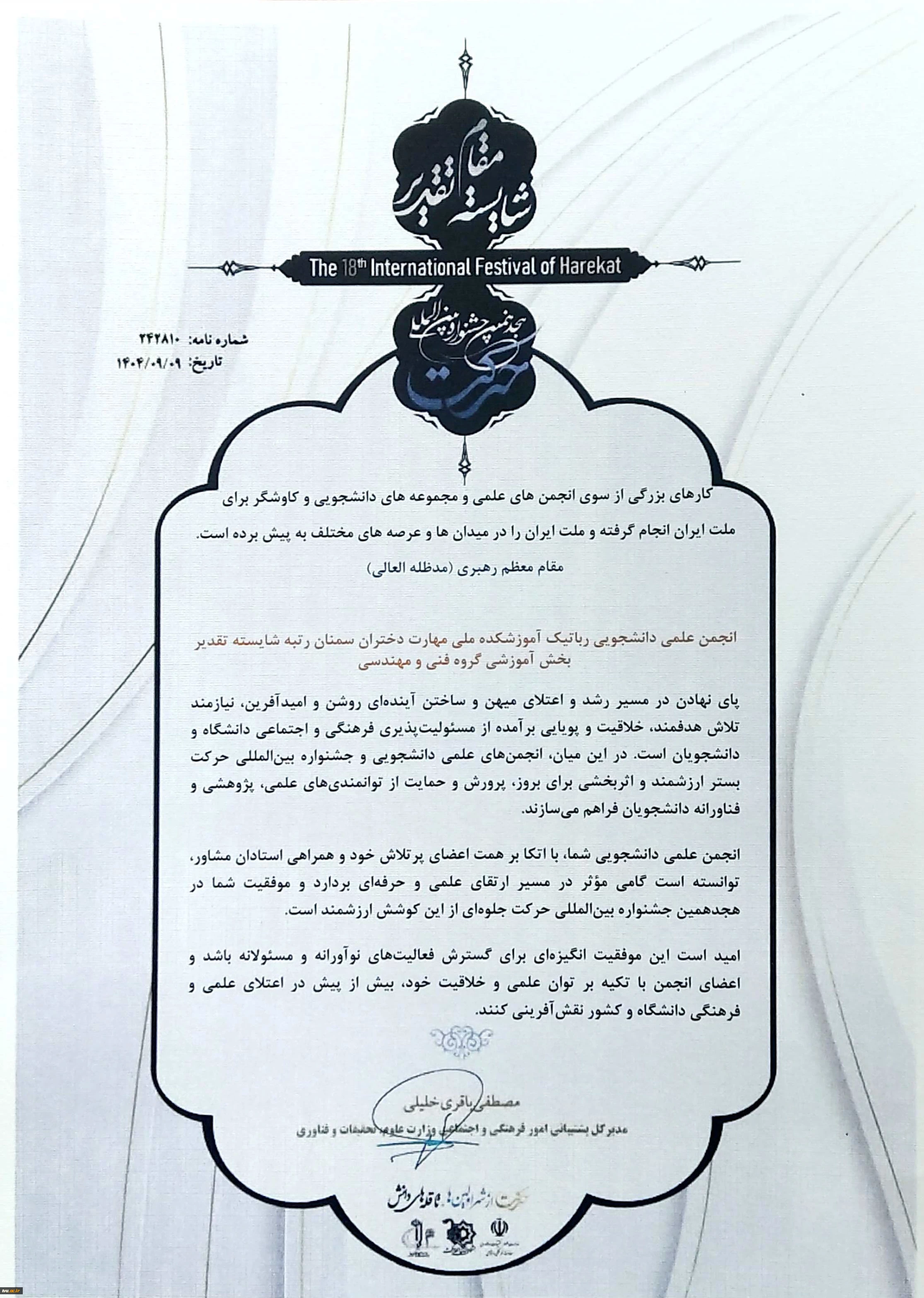 امتیاز دهید : افتخارآفرینی انجمنهای علمی دانشجویی دانشگاه ملی مهارت در هجدهمین جشنواره بین المللی حرکت وزارت علوم، تحقیقات و فناوری 13 شنبه 22 آذر 1404 ساعت 12:40