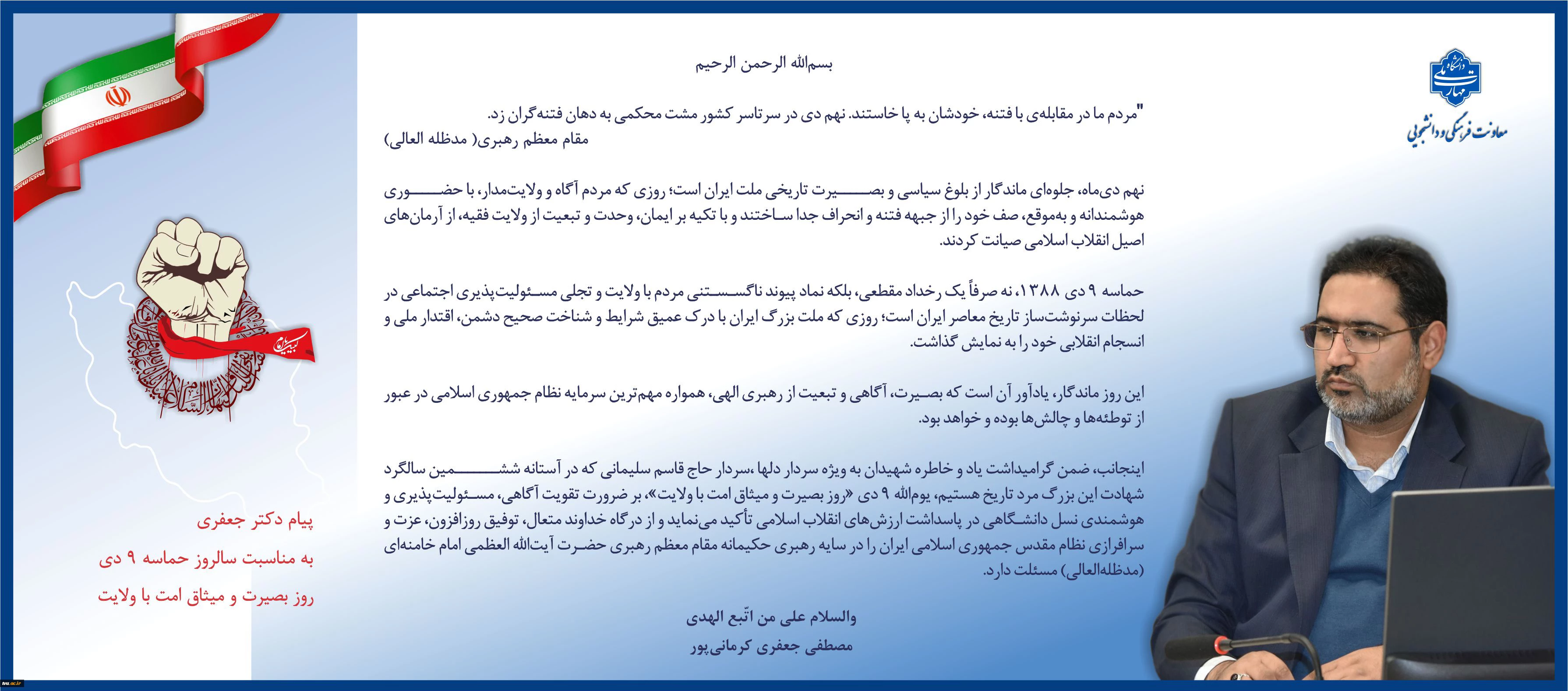 امتیاز دهید : معاون فرهنگی و دانشجویی دانشگاه ملی مهارت، به مناسبت سالروز حماسه ٩ دی روز بصیرت و میثاق امت با ولایت، پیامی صادر کرد. 2 دوشنبه 8 دی 1404 ساعت 9:55