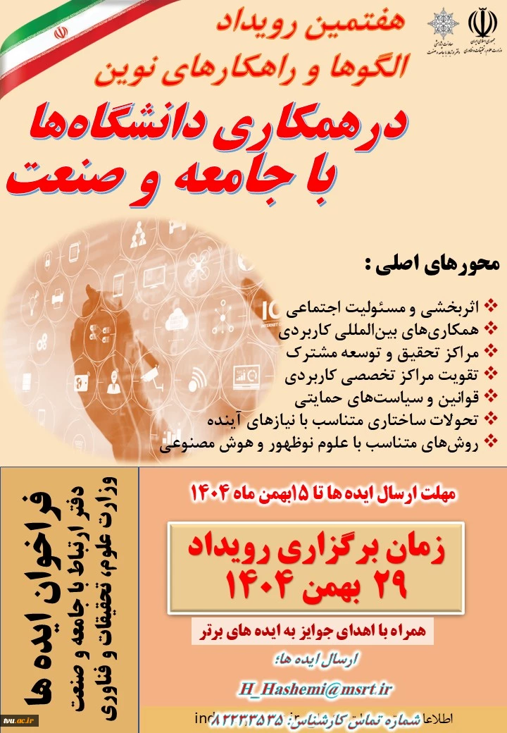 امتیاز دهید : هفتمین رویداد الگوها و راهکارهای نوین ؛ اطلاع رسانی مدیران روابط عمومی دانشگاه ها 2 چهارشنبه 24 دی 1404 ساعت 13:12