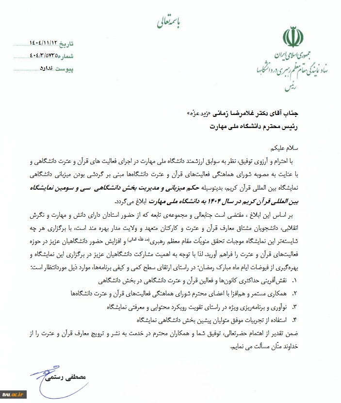 امتیاز دهید : دانشگاه ملی مهارت میزبان بخش دانشگاهی سیوسومین نمایشگاه بینالمللی قرآن کریم 22 یکشنبه 19 بهمن 1404 ساعت 8:01